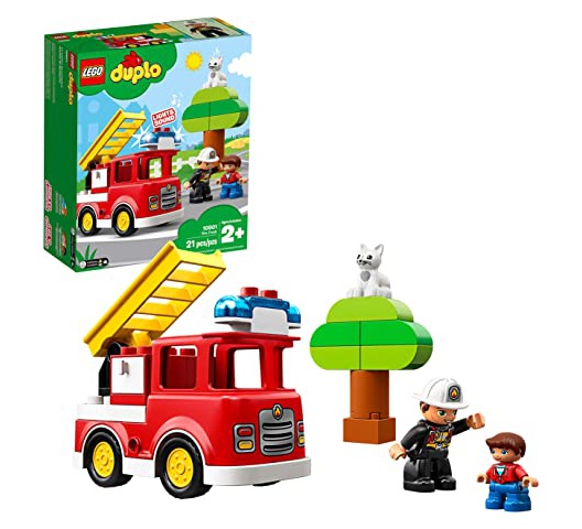 Play out real-life scenarios in LEGO® DUPLO® Town: a recognizable world with modern DUPLO figures. Help your little firefighter rush to the rescue in the 10901 Fire Truck for kids with flashing blue light and siren sound! This fire truck toy is easy to build with an opening drawer and a ladder. Toddlers will love to help the firefighter rescue the cat from the buildable tree! Includes 2 DUPLO figures and a cat figure.